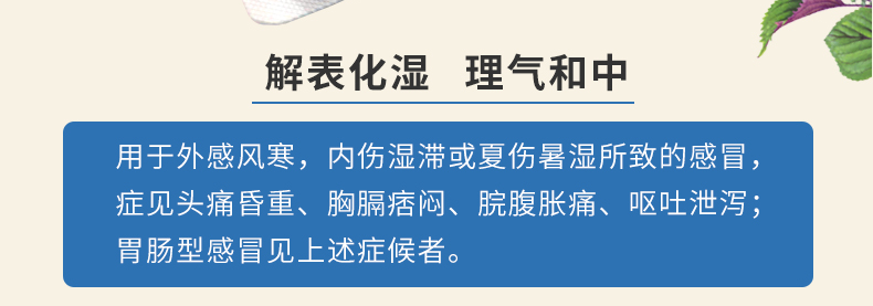 解表化湿,理气和中。用于外感风寒、内伤湿滞或夏伤暑湿所致的感冒,症见头痛昏重、胸膈痞闷、脘腹胀痛、呕吐泄泻;胃肠型感冒见上述证候者。